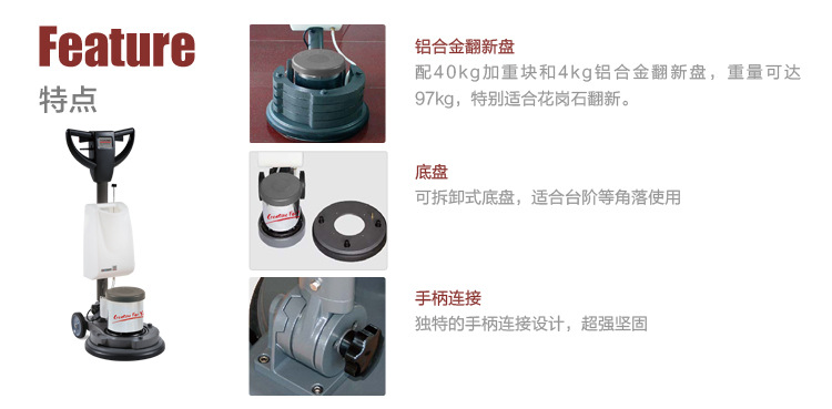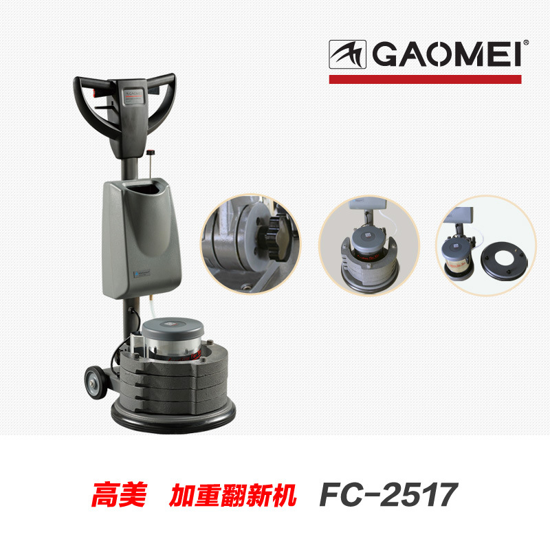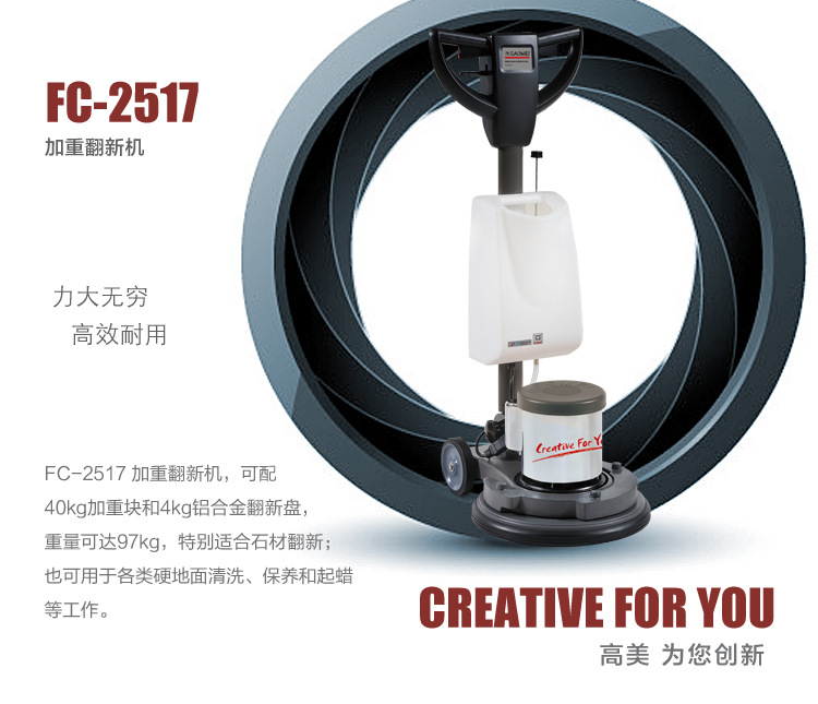 FC-2517 加重翻新機,可配40kg加重塊和4kg鋁合金翻新盤,重量可達97kg,特別適合石材翻新;也可用于各類硬地面清洗,保養和起蠟等工作。適合工礦、大廈、營業廳,尤其保潔公司用于石材日常護理及特殊處理。