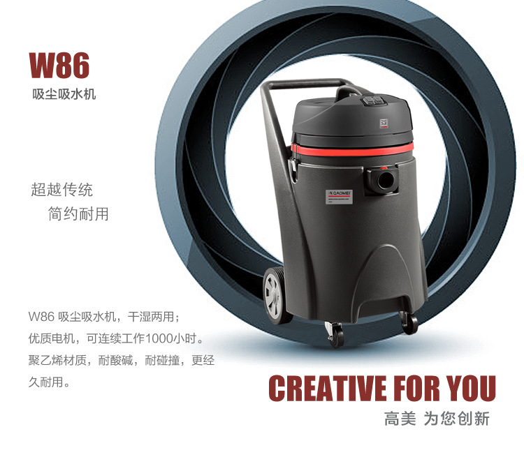 W86吸塵吸水機,干濕兩用, 優質電機,可連續工作1000小時。聚乙烯材質,耐酸堿,耐碰撞,更經久耐用。適用于賓館、酒店、餐廳、大廈、辦公室、學校、醫院、超市、洗車行以及工礦企業單位。