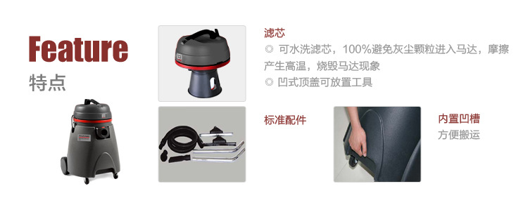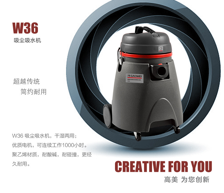 W36 吸塵吸水機,干濕兩用;優質電機,可連續工作1000小時。聚乙烯材質,耐酸堿,耐碰撞,更經久耐用。適用于賓館、酒店、餐廳、大廈、辦公室、學校、醫院、超市、洗車行以及工礦企業單